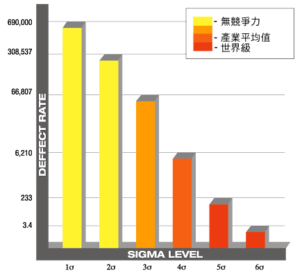六標準差 (Six Sigma) 利用統計學的概念來衡量流程中的瑕疵。達 到六標準差,即意味著您的生產流程中僅會有百萬之 3.4 的不良率 (Defects per Million Opportunities, DPMO) ;換句話說,這表示已經接近完美狀況。Sigma (σ) 是希臘字元,為「標準差 (Standard Deviation)」的衡量。在商業術語中,其代表「流程」與「完美」的偏差值。
